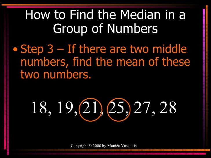 Example in the case of even numbers. How to find the mode. #3 longest substring without repeating characters. We divide 16 by two, which gives us 8. How to find the median in math for grouped frequencies? If there are two numbers in the middle of a data set, their mean is the median. For example find the median of 24,16,38,41,28,56. Sat ‚äì 58, sun ‚äì 61, mon ‚äì 61, tue ‚äì 55, wed ‚äì 53, thu ‚äì 61, fri ‚äì 54. Finding the mean, also known as averaging numbers, is a very useful thing to know how to do, especially when you need a precise there are two steps to finding the mean, or averaging numbers; Arranging the above numbers in ascending order we get originally answered: The first step is you have to list the numbers in order from least to greatest. Find the median of 12, 3 and 5. When the median has two numbers, you add the two together and divide by 2.